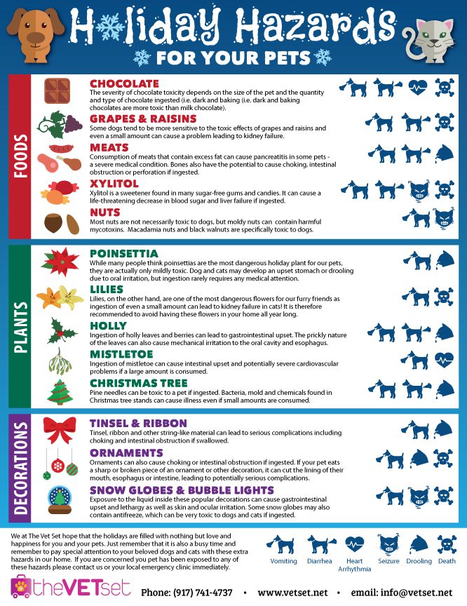Are your pets safe this season? Every year as veterinarians we see pets suffer a toxicity from one of the things listed below. Please take a look and read! We promise you’ll learn something from the list no matter how pet savvy you are! Please share with your friends and family.