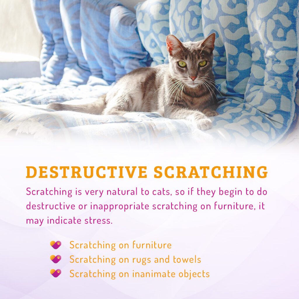 The stress may manifest as litter box issues, destructive scratching, hiding, being extra clingy, overgrooming, and a decreased appetite.